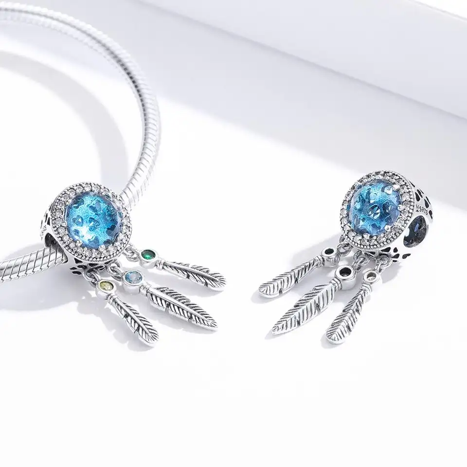 Captura la esencia de tus sueños con el ‘Charm de Plata Sueños Atrapados’, embellecido con un místico cristal azul y plumas detalladas. Un amuleto para la inspiración y la esperanza.