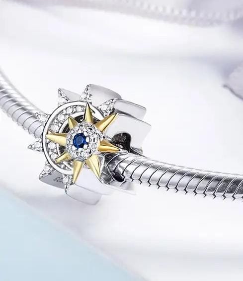 El Charm Eclipse captura el espectáculo celeste de un eclipse solar con su diseño estelar. Elaborado en plata de ley con detalles en oro y un cristal azul central, este charm representa el contraste armonioso entre el sol y la luna. Los cristales circundantes simbolizan las estrellas, creando una pieza que es tanto una maravilla astronómica como una joya deslumbrante.
